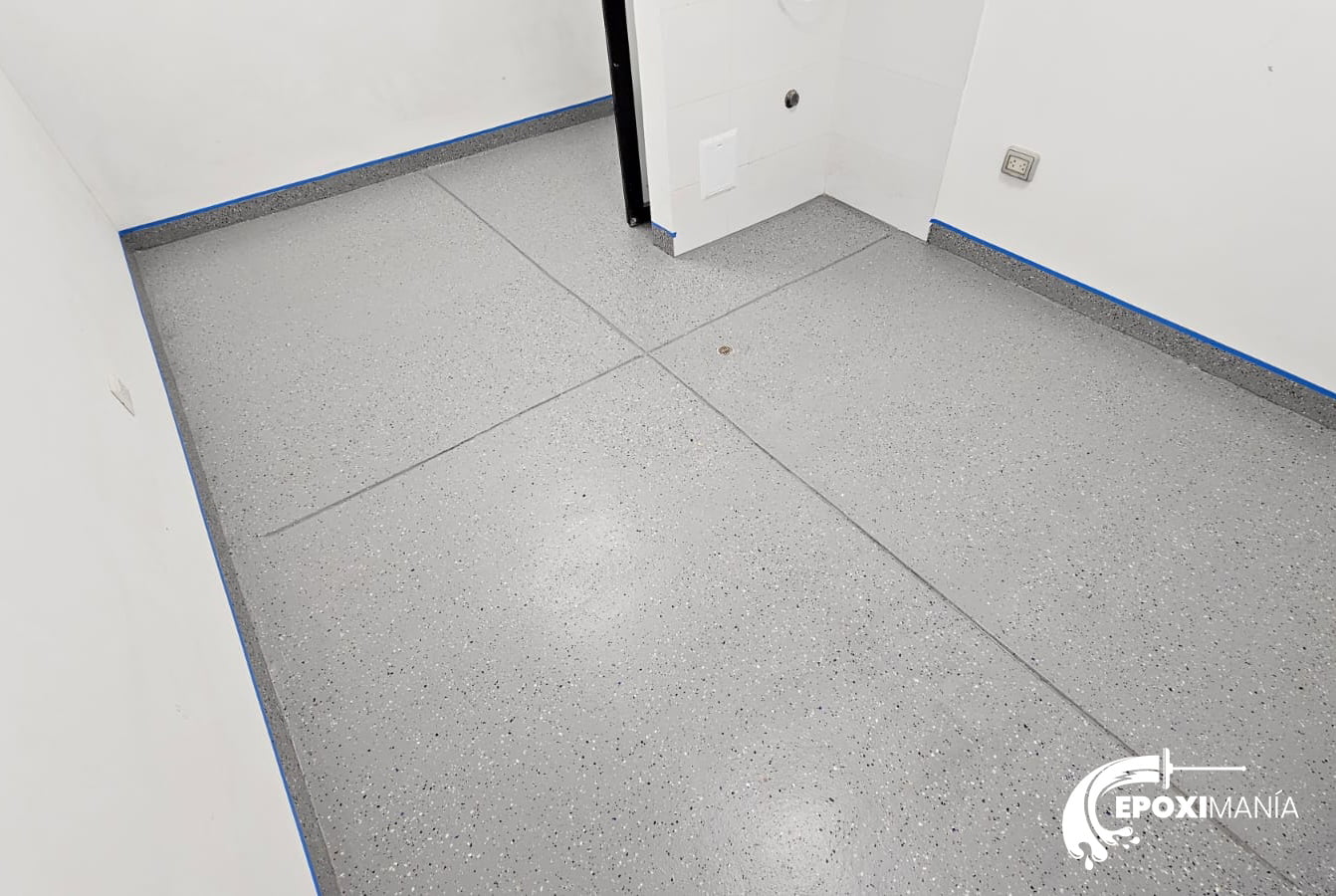 El piso tiene una tonalidad gris claro, con un espesor de 2 a 3 milímetros de recubrimiento epóxico. El procedimiento de instalación comenzó con la preparación de la superficie y la reparación de grietas y fisuras. Luego, se aplicó un sellador de concreto, seguido de un mortero autonivelante. Finalmente, se aplicaron una imprimación epóxica, flakes y una capa de resina epóxica transparente.